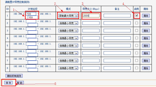4、在“IP地址段”填写上DHCP服务器地址池的开始地址和结束地址--->在“模式”下面选择“限制最大带宽”--->在“宽带大小”列填写允许使用的最大带宽--->在“启用”列下勾选对应的方框--->点击“保存”。