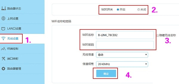点击“无线设置”——>“WiFi开关”选择:开启——>然后设置“WiFi名称”、“WiFi密码”——>点击“确定”。